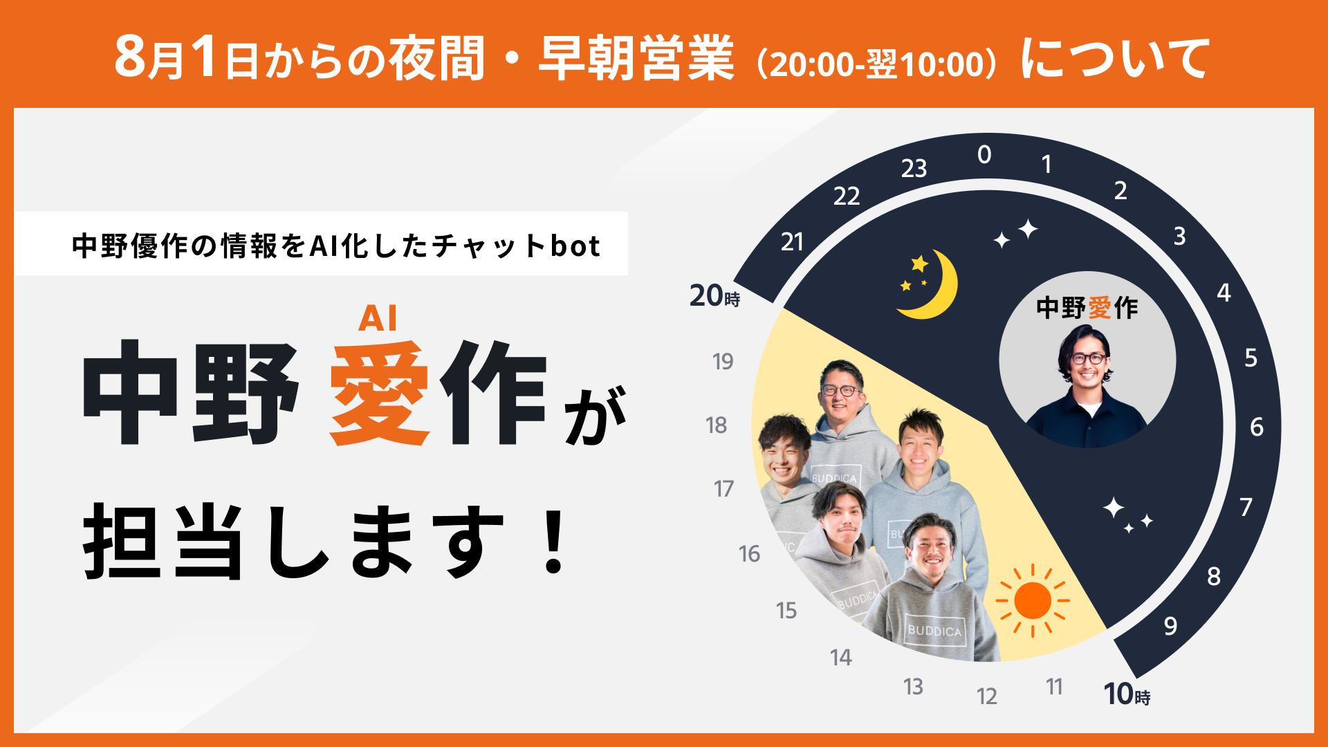 バディカダイレクト株式会社 (URL: /本社:東京都渋谷区 / 代表取締役社長:中野 優作)は、6月24日に入社した中野愛作クンの入社1か月間の結果及び、8月1日以降の夜対応の体制変更について発表させていただきます。