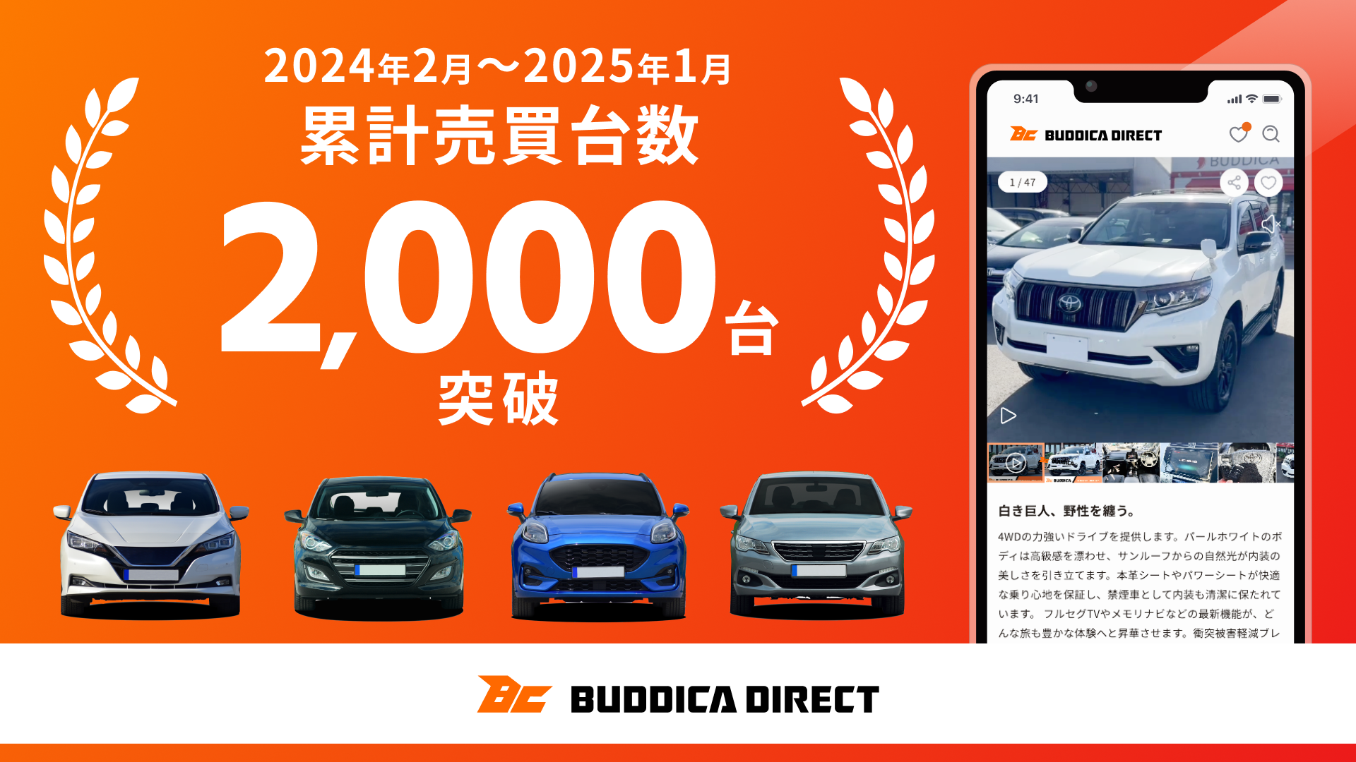 WebやLINEのやり取りだけで中古車販売を全国規模で展開するバディカダイレクト株式会社(URL: / 本社:東京都渋谷区 / 代表取締役社長:中野 優作)は、2024年1月24日に創業。“満1才”を迎えた2025年1月24日時点で、累計売買台数2,000台を突破しました。