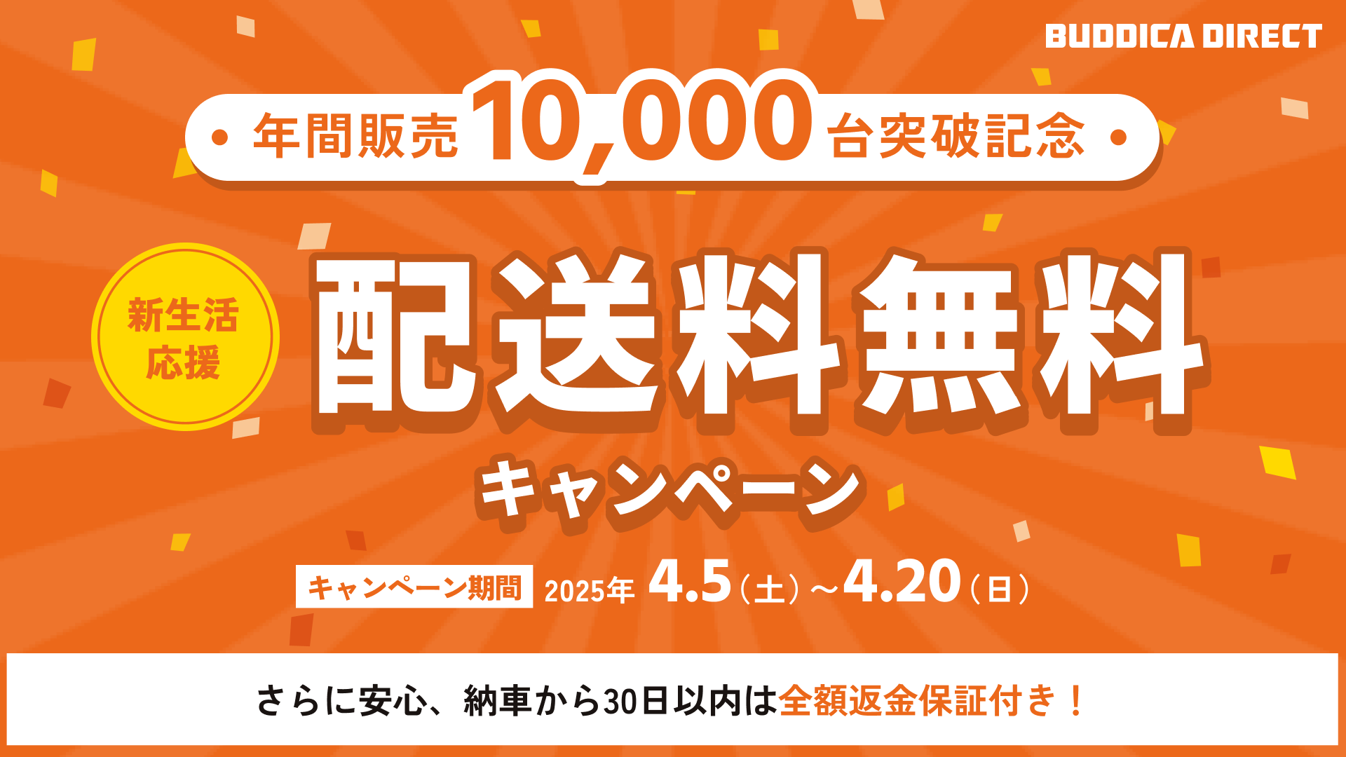 BUDDICAは年間販売台数が1万台を突破いたしました。これもひとえに、多くのお客さまからいただいた温かいご支持のおかげです。感謝の気持ちをより多くのお客さまへお届けしたい、また新生活を迎える皆さまに愛車とともに素敵なスタートを切っていただきたい、という想いから、「クルマの配送料無料キャンペーン」を実施する運びとなりました。
